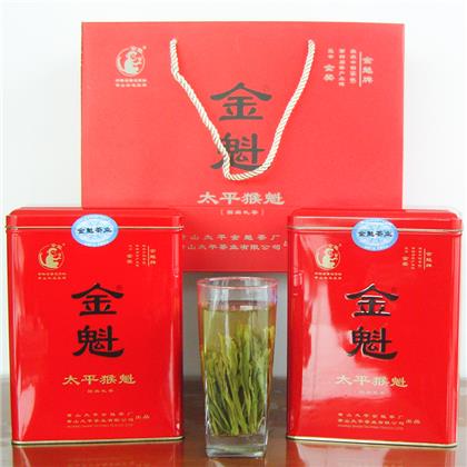 本产品为【金魁牌】太平猴魁~献礼版系列;选用太平猴魁核心产区鲜叶加工而成,产品品质优良,清香浓郁,滋味甘醇爽口,汤色明绿,经久耐泡。